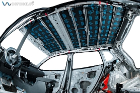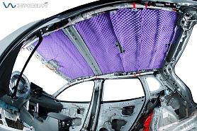 Следующий этап – шумоизоляция крыши. Максимально аккуратно чистыми одноразовыми перчатками демонтируем потолочную обшивку и обезжириваем поверхность потолка. После предварительной подготовки приступаем к шумоизоляции.