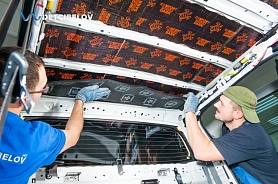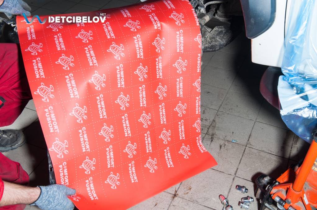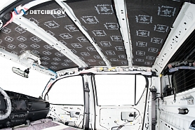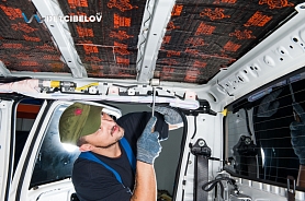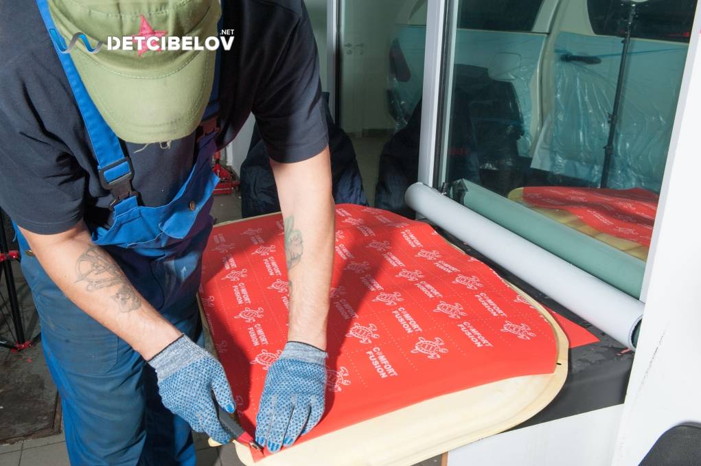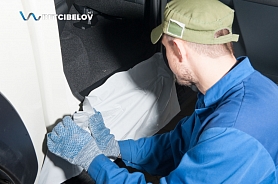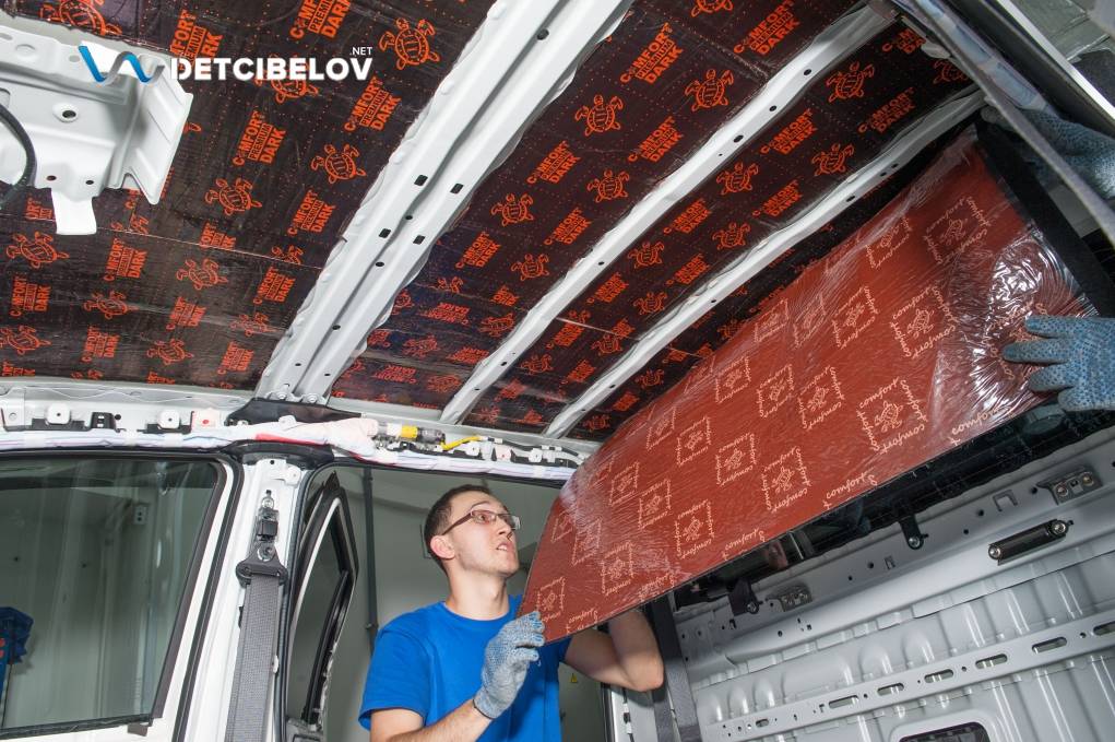 Подготовленный виброизолятор укладываем на полу в салоне, за исключением участка под задним диваном. На этом участке, в связи с недостатком места, используем более тонкий вибродемпфер Comfort mat Dark D3 Premium (3 мм). Им же покрываем стенку под задним стеклом.