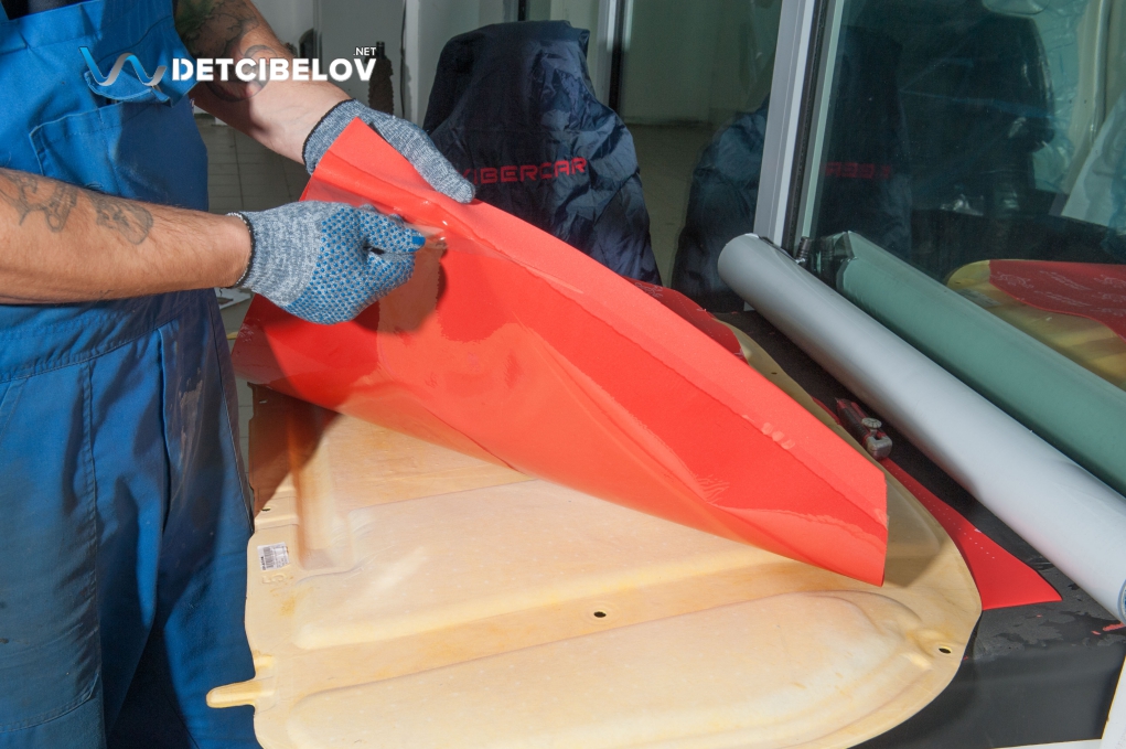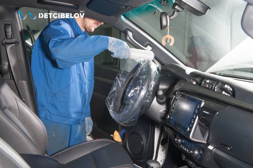 Чтобы не повредить лакокрасочное покрытие кузова во время проведения работ, оклеиваем его пленкой. Пластиковые детали укутываем в стрейч-пленку, арки дверей – обклеиваем скотчем. Используем чехлы для защиты руля и оборудования, которое остается в салоне.