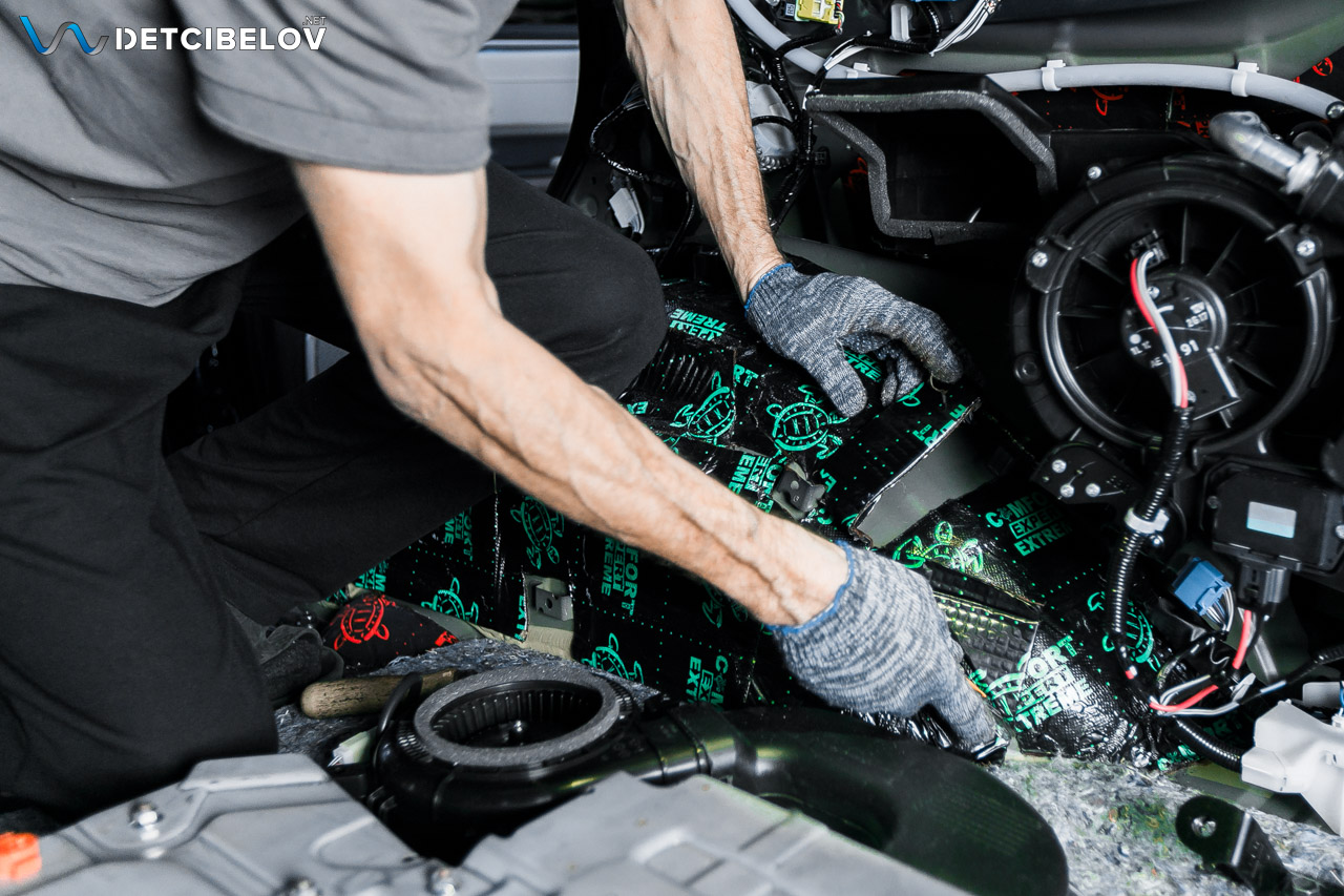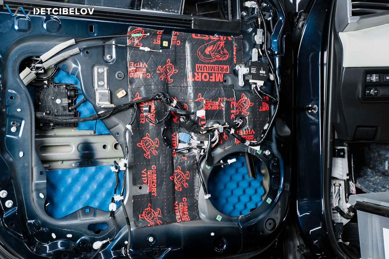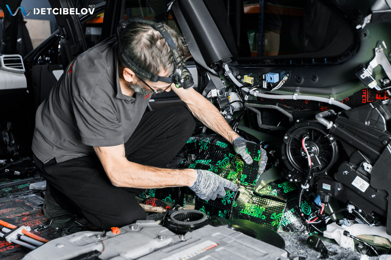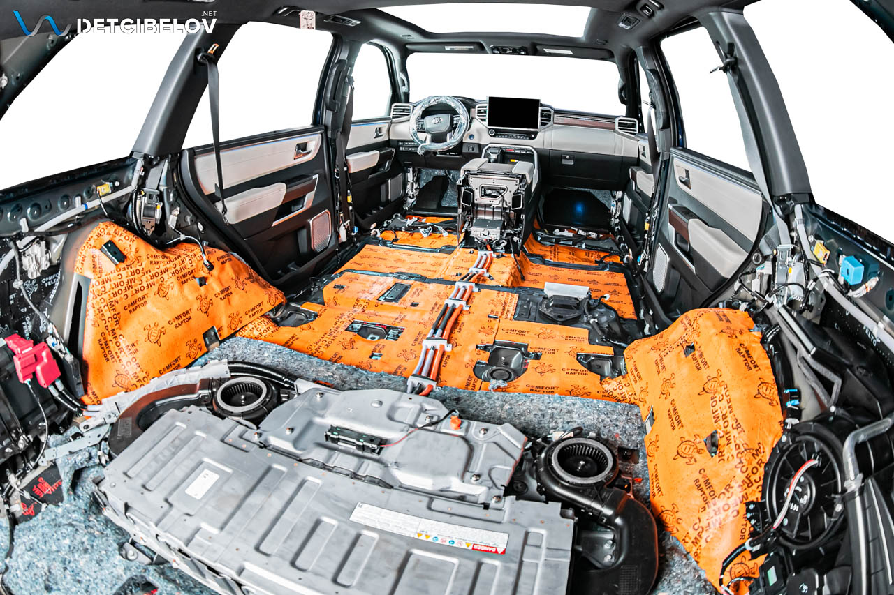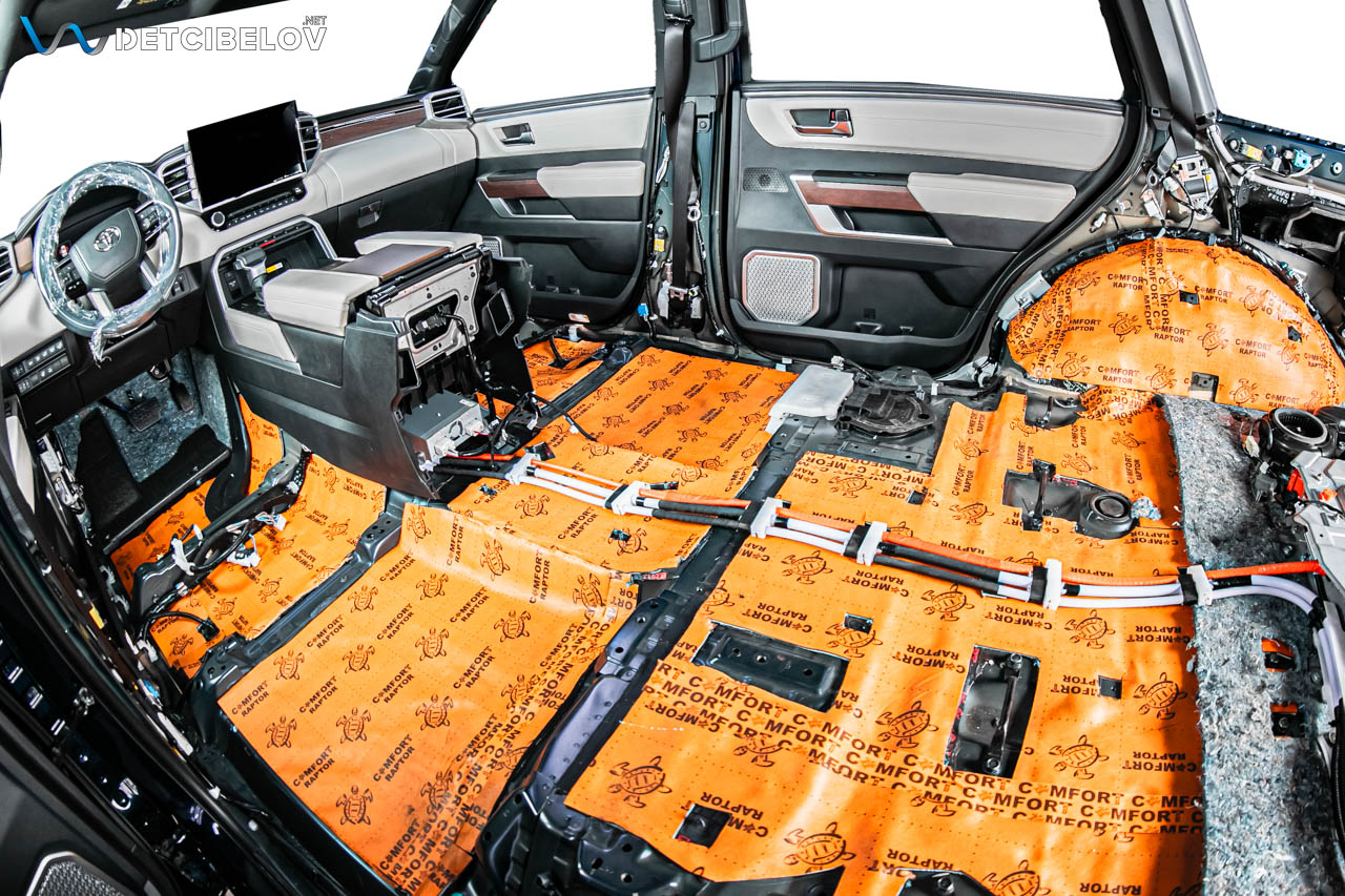 • Никаких компромиссов! Только топовые материалы последнего поколения от ТМ "Comfort mat" с максимальной эффективностью и максимальным количеством слоев. Также использование вибродемпфирующих материалов высокой жесткости с разогревом в печи и дополнительной напыляемой шумоизоляцией для колесных арок.