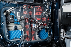 • Самая легкая шумоизоляция автомобиля от ведущих брендов. Она обеспечивает оптимальный результат при однослойной обработке кузова автомобиля. Материал обладает одновременно как шумо-, так и виброизоляционными свойствами, что позволяет укладывать материал в один слой, вместо двух, используемых при многослойной классической шумоизоляции автомобиля. Также мы дополнительно обрабатываем двери акустическим материалом для снижения скрипов и увеличения акустического комфорта.