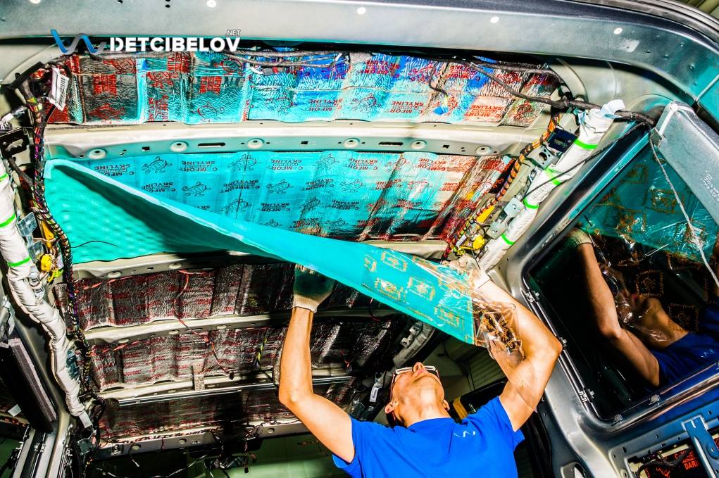 Для обесшумливания крыши демонтируем обшивку потолка. Команда работает в защитных перчатках, чтобы не оставить следов.