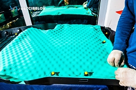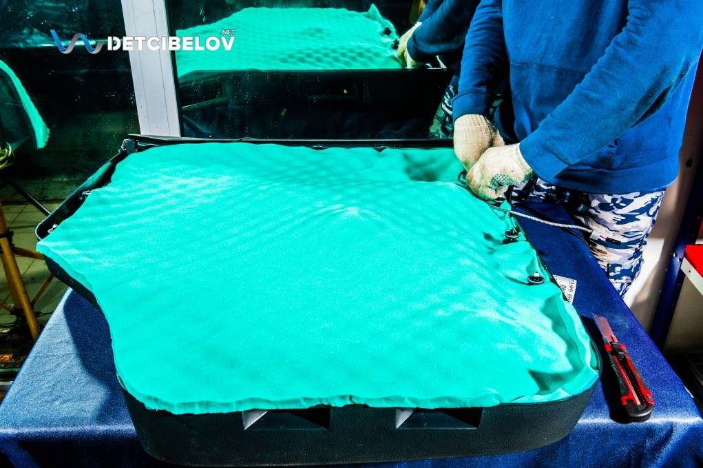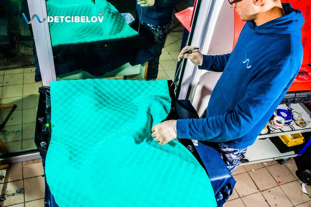 Затем наносим еще один слой виброизолятора Comfort mat Dark D3 Premium (3 мм) на центральную вставку, и укладываем шумопоглотитель Comfort mat Wave Expert (15 мм): материал на основе вспененного пенополиуретана, состоящий из множества мелких ячеек, эффективно задерживает сторонние шумы.