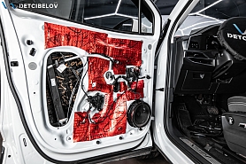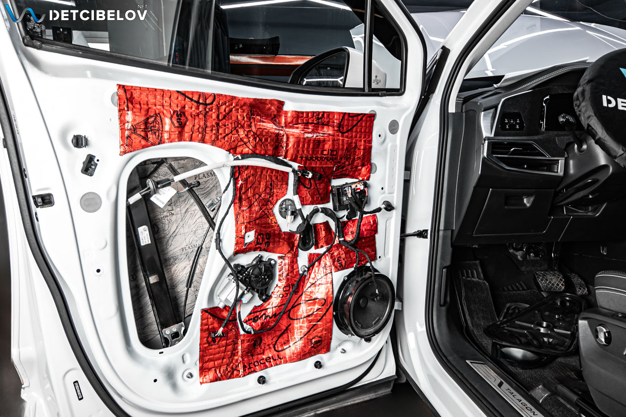 • Самая легкая шумоизоляция автомобиля от ведущих брендов. Она обеспечивает оптимальный результат при однослойной обработке кузова автомобиля. Материал обладает одновременно как шумо-, так и виброизоляционными свойствами, что позволяет укладывать материал в один слой, вместо двух, используемых при многослойной классической шумоизоляции автомобиля. Также мы дополнительно обрабатываем двери акустическим материалом для снижения скрипов и увеличения акустического комфорта.