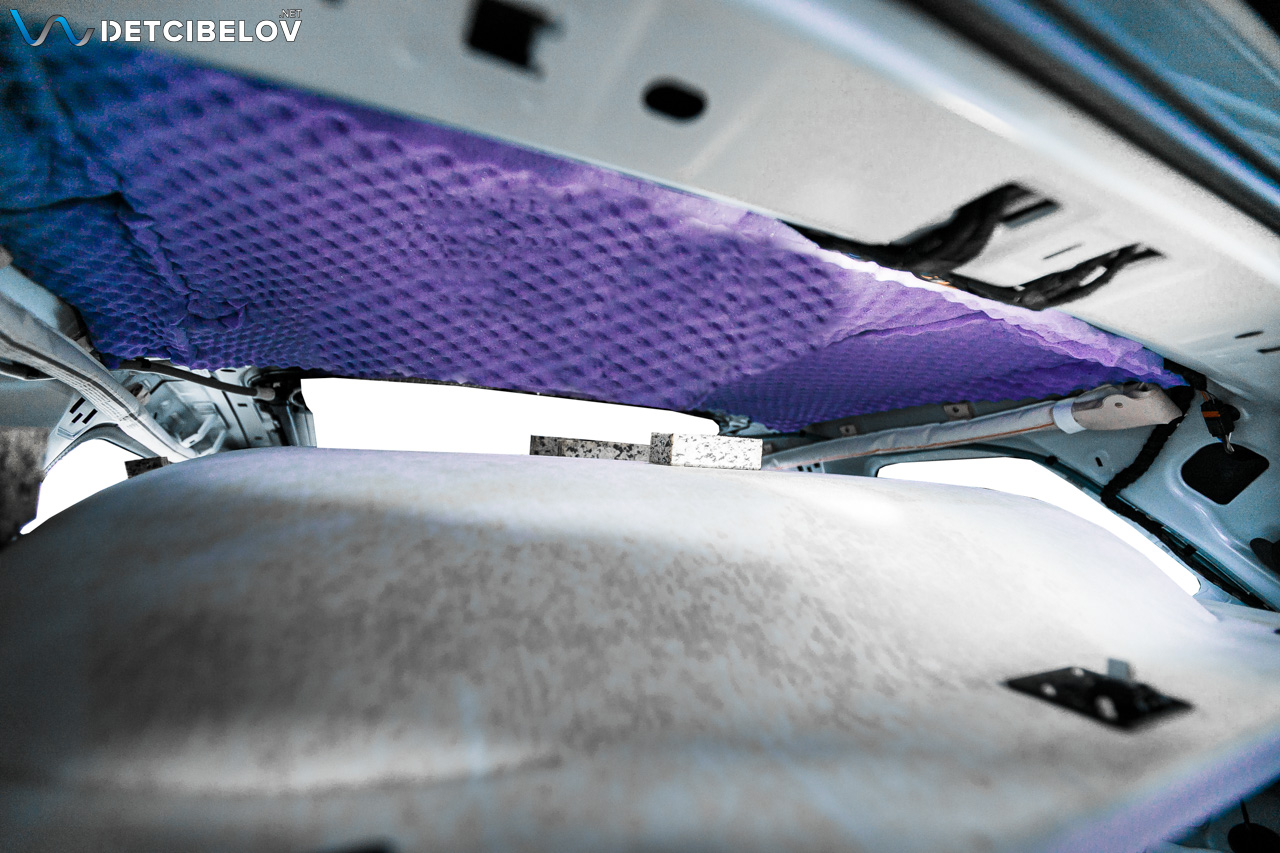 Следующий этап – шумоизоляция крыши. Максимально аккуратно чистыми одноразовыми перчатками демонтируем потолочную обшивку и обезжириваем поверхность потолка. После предварительной подготовки приступаем к шумоизоляции.