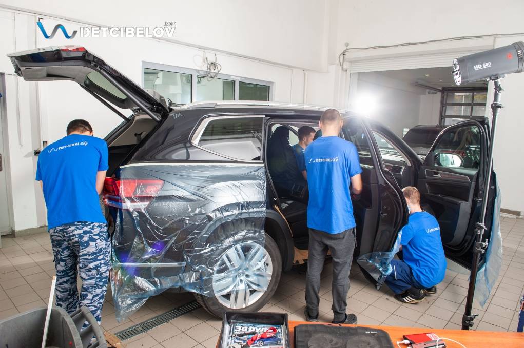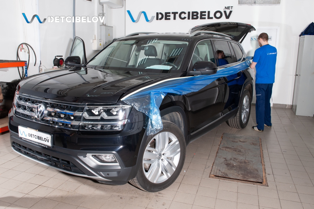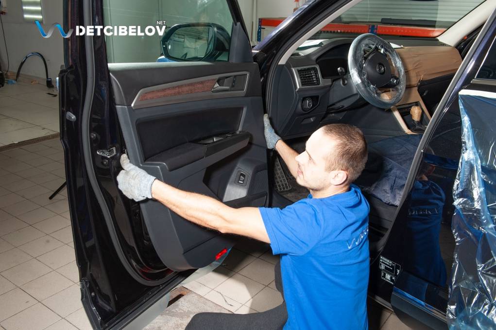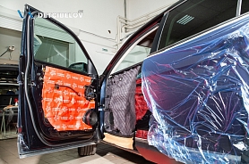 Полная шумоизоляция Volkswagen Teramont I поколение начинается с предварительной подготовки. Ее цель – защитить внешние элементы автомобиля и детали салона от повреждений в процессе выполнения работ. Для этого оклеили широким скотчем пороги и арки дверей, упаковали в стретч-пленку мелкие детали, обычную пленку – внешние элементы. Чтобы защитить сиденья и карты дверей, спрятали их в специальные чехлы.