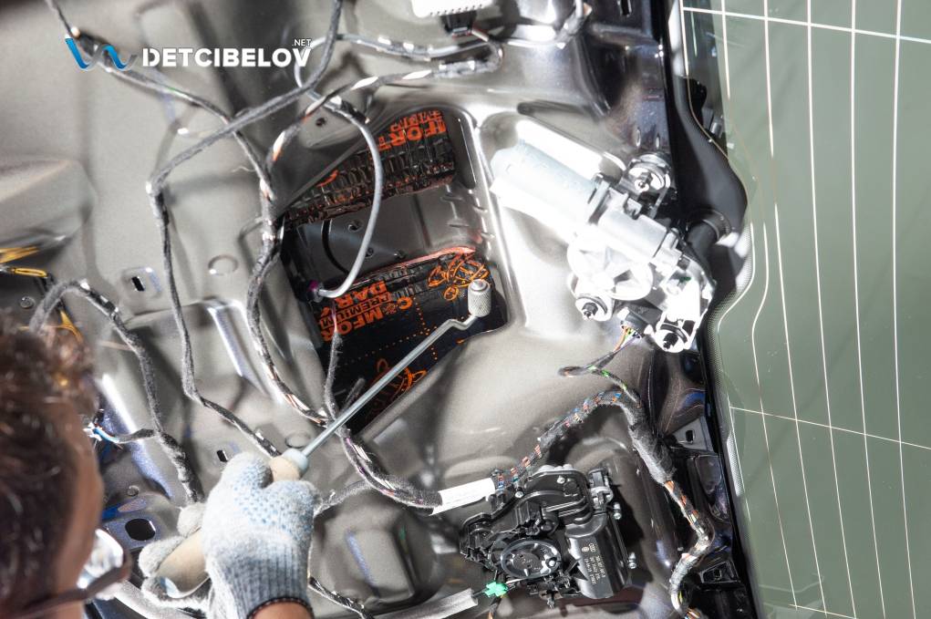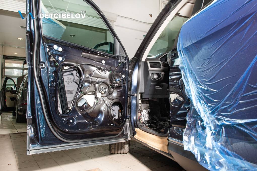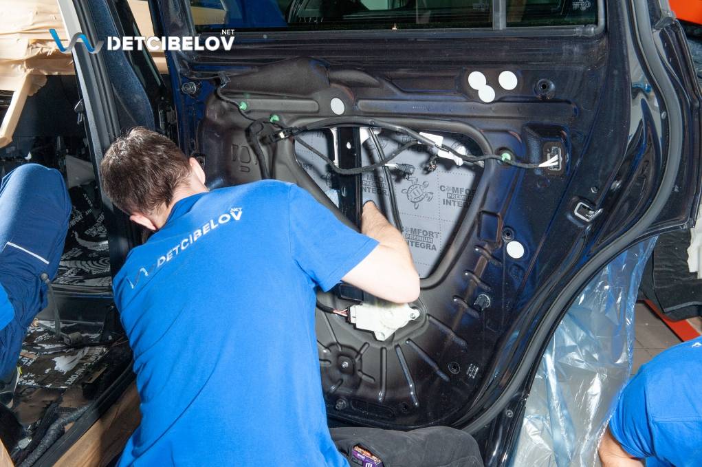 Первый шаг к обесшумливанию автомобиля «под ключ» – шумоизоляция дверей. Для этого наш специалисты демонтируют обшивку и подготавливают поверхность: очищают и обрабатывают обезжиривателем. На этом участке будет использоваться 4 слоя шумоизоляционных материалов.