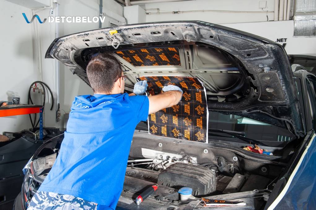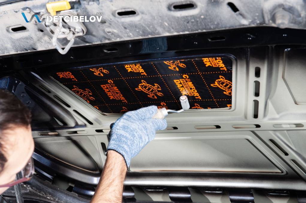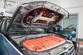 Законичив работу над обесшумливанием пола, переходим к зоне капота и крышки багажника. Здесь также нужна комплексная защита – комбинация из виброизоляционных и шумопоглощающих материалов.