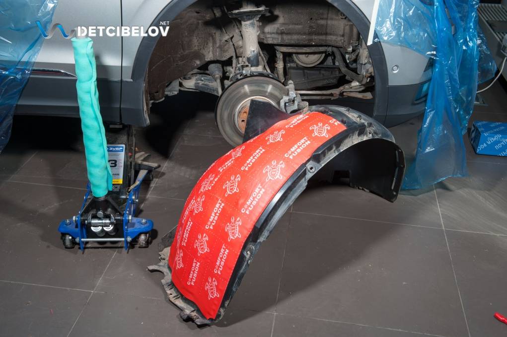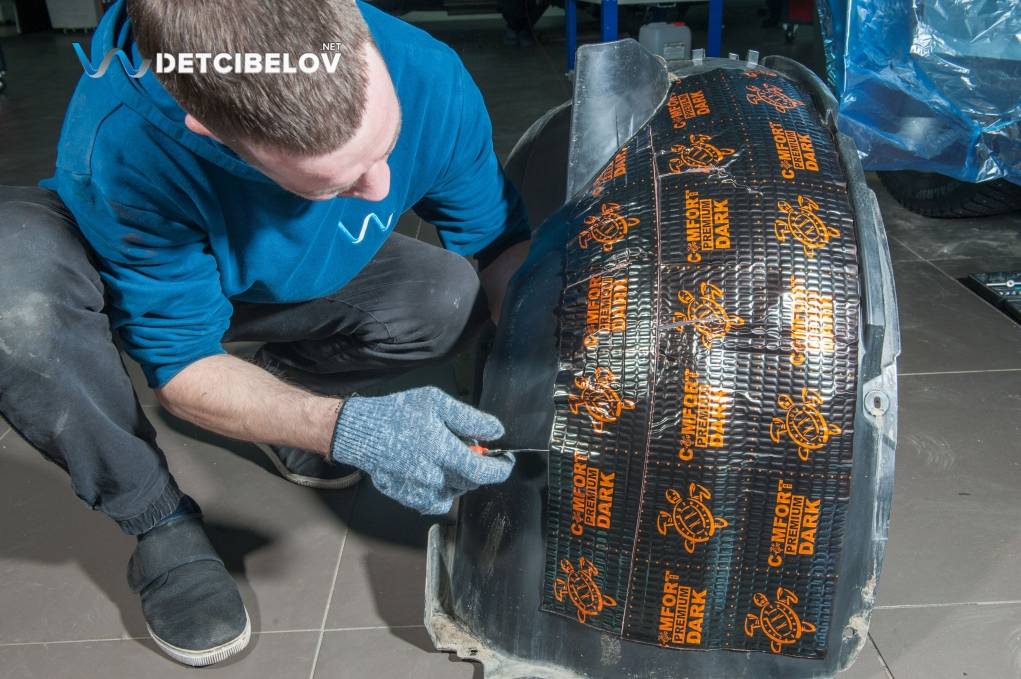 Подкрылки автомобиля оклеиваем универсальной виброизоляцией Comfort mat Dark D3 Premium (3 мм).