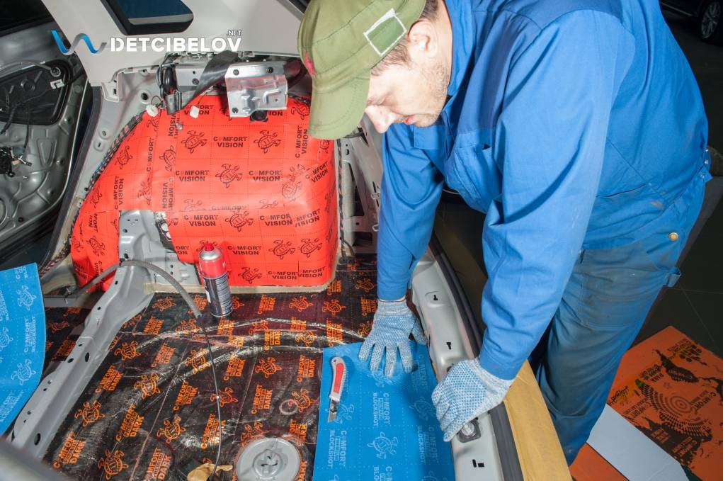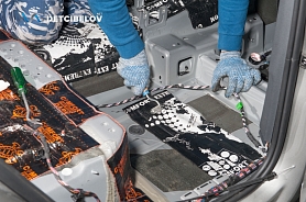 Подготовленным вибродемпфером Comfort mat Extreme 3.5 (3,5 мм) выстилаем на пол в салоне, задние крылья и внутренние арки. Из-за ограниченности свободного места под задним рядом сидений и в нише багажника укладываем облегченный виброизолятор Comfort mat Dark D3 Premium (3 мм).