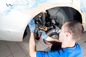 Перед началом проведения работ мы закрываем все детали кузова и интерьера, которые не участвуют в процессе. Так, для защиты арок дверей используется скотч, руля и оборудования – чехлы, мелких пластиковых деталей – стрейч-пленка.