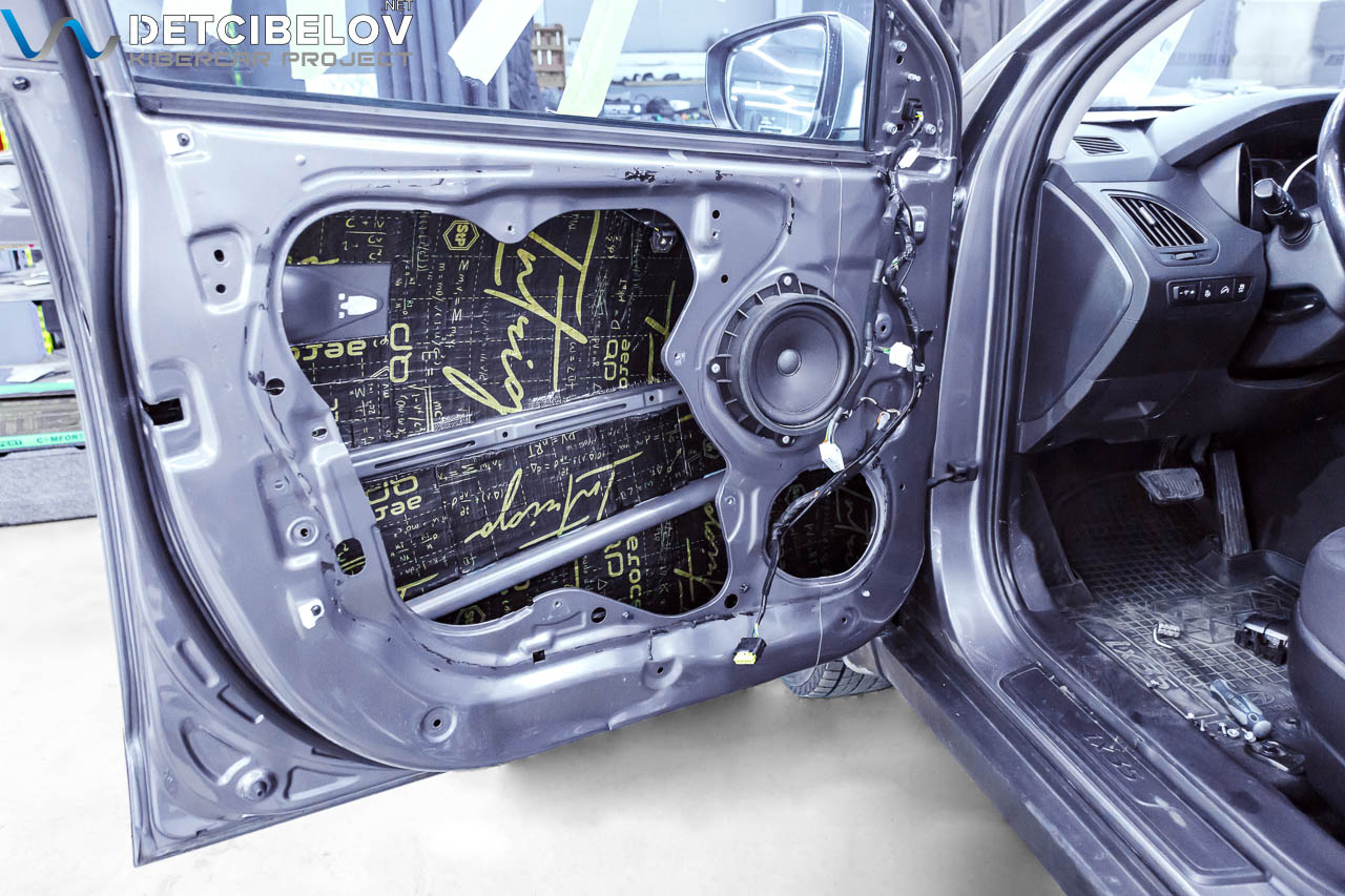 Работы по шумоизоляции начинаем с дверей. Максимально аккуратно разбираем дверные обшивки. После этого подготавливаем поверхность и обезжириваем все участки и наносим первый слой: