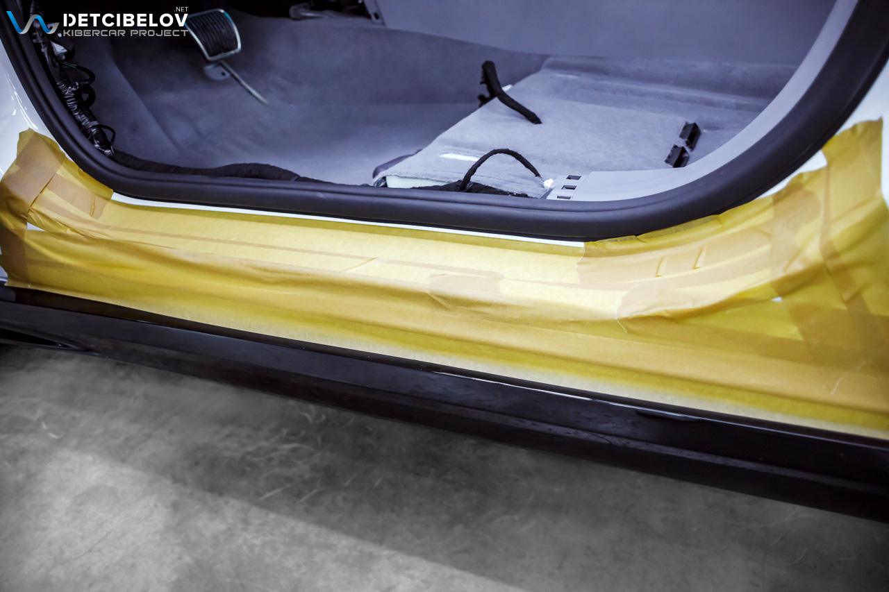 Приступаем к работе. Первым делом максимально защищаем автомобиль: оклеиваем пленкой все внешние элементы автомобиля, затем наносим скотч на пороги и арки дверей, упаковываем все мелкие пластиковые элементы в стретч-пленку. Сиденья и карты дверей помещаем в специальные чехлы.